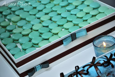 Macarons em caixinha de acetato e com um mini rolo de macarrão. Mais uma opção de lembrança no chá-de-panela.